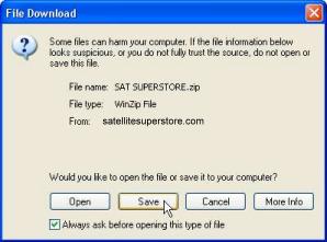 The Save As window will appear & then click the DESKTOP icon on the left panel, you can then click the save button & the zip file with the Satellite Superstore Database in it will be down loaded to your desktop. Browse to your desktop & extract the downloaded file using either Winzip or the built in Microsoft XP zip utillity. |
