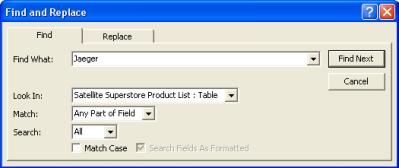 When searching using the Binoculars Find function for a key word (ie:Jaeger) then make sure the "LOOK IN" "MATCH" & "SEARCH" sections are set as in the example to the right. The database will also be updated at regular intervals when we have new lines added to our extensive range of products. |